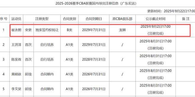 現(xiàn)在崔永熙正在東莞進行康復(fù)訓(xùn)練,他肯定會出戰(zhàn)下賽季。之前已經(jīng)確定崔永熙加盟廣東了,不過最終的官宣動態(tài)現(xiàn)在才公布。因為CBA官網(wǎng)更新了2025-2026賽季CBA聯(lián)賽國內(nèi)球員注冊信息,我們明顯可以看到廣東宏遠(yuǎn)已成功為崔永熙完成注冊,并與其簽下四年B類合同,合同將于2029年7月31日到期。