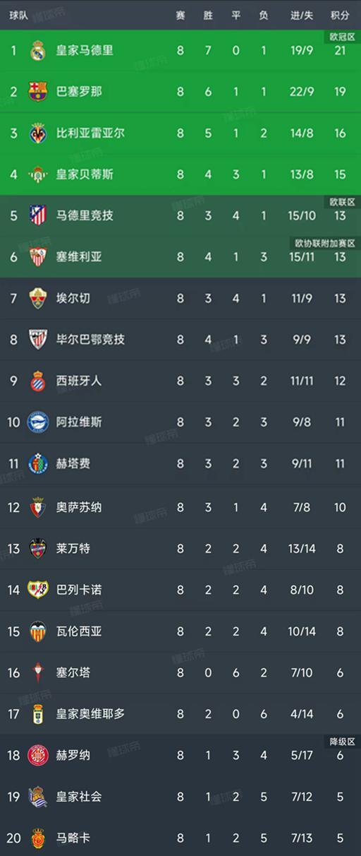 隨著巴薩1-4,馬競1-1,西甲第8輪最新積分榜如下,皇馬重返第1